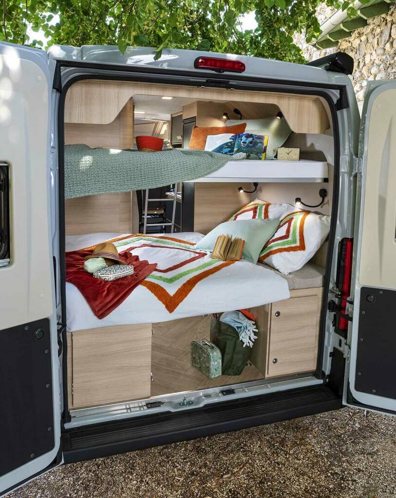 Stapelbedden in campers zijn bovendien een modulaire oplossing. Soms kan een bed opgeklapt worden om meer ruimte en bewegingsvrijheid in de camper te creëren. Of het onderste bed kan opgeklapt worden om toegang te krijgen tot de garage waar de kampeerspullen zijn opgeborgen.